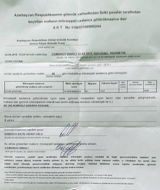 Mən, Binəli Osmanov 02 fevral 1972-cu ildə Gürcüstan respublikasının Dmanisi rayonunda anadan olmuşam. İşimlə bağlı son illəri müvəqqəti olaraq Abşeron rayonun Aşağı Güzdək qəsəbəsində yaşayıram. Hər iki aydan bir doğma yurduma- Gürcüstana gedib gəlirəm. Və hər dəfə də Azərbaycana qayıdanda özümlə normaya uyğun ərzaq mallarından da gətirirəm. Lakin bu ilin mayın 4-də “Sınıq körpü” Postunda Azərbaycan tərəfin gömrük işçisi namazov Natiq Vidadi oğlu (təbii ki, əslən Naxçıvandan olan, başqa cür ola da bilməz) Gürcüstandan mənimlə birlikdə gələn Şabanov Bəxtiyar Vidadi oğlu və mənə məxsus olan, hər birimizə aid 5 l çaxırı əlimizdən alıb müvəqqəti saxlanca qoydular. Və yaxşı ki, AKT da bağladılar.