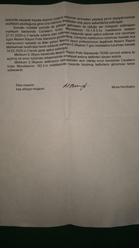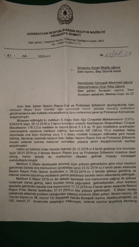 Hörmətli cənab nazir Vilayət Eyvazov! Biz və bizim kimi onlarla günahsız şəxslər məhkum dələduz Elvin Əliyevin cəmiyyətə vurduğu maddi ziyanların qarşısının alınması üçün 14 fevral 2020-ci il tarixli Nəsimi rayon məhkəməsinin “Məhkum E.G.Əliyevin şərti cəzasının ləğv edilərək həbslə əvəz edilməsi barədə” qərarının icra edilməsi üçün onun hazırda şəxsi ailə üzvləri,atası,anası, qardaşıilə birlikdə yaşadığı Binəqədi rayonu, Azadlıq prospekti, ev 185, mən 27 ünvanından və yaxud Ağsu şəhəri, Həzi Aslanov küçəsi, ev 16-da şəxsi mənzilindən və yaxud, qanuni təmsilçisi olduğu və Yasamal rayonu,Ə.Əbilov küç., 94 ünvanda yerləşən və hazırda atası, qardaşı və xalasıoğlu tərəfindən idarə edilən “Röyal Print”MMC-nin ofisindən, və ya hazırda istifadə etdiyi 050-415 .... mob., tel. vasitəsilə tapılaraq Yasamal RPİ-nin İstintaq Şöbəsinin müstəntiqi polis mayoru Firdovsi Nəsirova təhvil verilməsi üçün göstəriş verəsiniz. Əvvəlcədən təşəkkürlər.