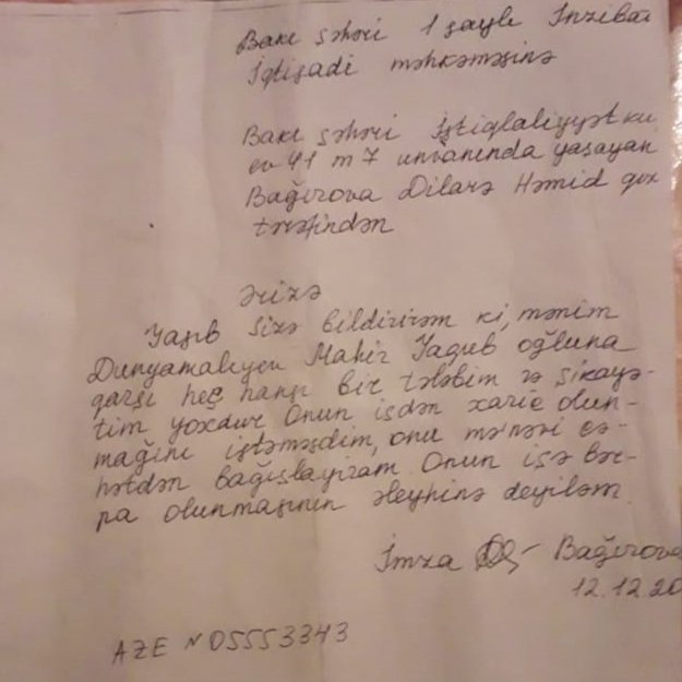 Mən son ümid olaraq Cənab Daxili işlər naziri Viayət Eyvazova işimə bərpa olunmağım barədə mraciət etmişəm. Məlumdur ki, cənab nazir yeni vəzifəsinin icrasına başlarkən Quba rayonunda vətəndaşları qəbul edib problemlərinin əksəriyyətini yerindəcə həll edib. Və o cümlədən Şimal regionunda mənim kimi haqsız yerə işdən çıxarılmış 20-yə yaxın günahsız polis əməkdaşının dərhal işə qəbul edilməsi barədə göstəriş vermişdir. Bəli, cənab Prezident Nazir Vilayət Eyvazova məhz operativ, çevik qərar qəbuletmə və digər keyfiyyətlərini nəzərə alaraq bu vəzifəyə etimad edib təyin etmişdir. Müraciətimdə mən xidməti vəzifəmi yerinə yetirərkən qadın şərinə düşümüş və nəticədə əsassız yerə işdən çıxarılmış bir adi polis kimi cənab nazirdən xahiş etmişəm ki, işimə bərpa edilməyim barədə göstəriş versin. İndi ümidlə nəticəni gözləyirəm.