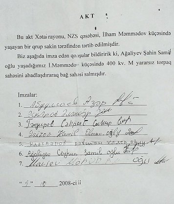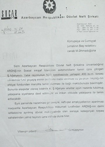 Əgər mən bir SOCAR işçisi kimi bu torpaqdan qonşuluqda olan başqaları kimi 20 ildir ki, ev tikmək üçün istifadə edə bilmirdimsə, onda bu kənar şəxslər ( Yusif, İlqar və onun arxasında duran generallar) necə olur ki, SOCAR ın sənaye kateqoriyalı ərazisinə milyonlar verib sənəd ala bilirlər, elektrik dirəklərini özbaşına yarım milyon rüşvət verib yerini dəyişdirirlər, torpağı hasarlayıb ildırımsürətilə hansısa obyektin tikintisinə başlayırlar? Doğrudanmı ölkədə bu dərəcədə dərəbəylik baş alıb gedir. Xatırladım ki, Babək prospektinin həmin ərazisində 1 sot torpağın qiyməti 100000 manatdır. Onu da xatırlatmaq yerinə düşərdi ki, torpağı adı hələlik bizə məlum olmayan generallara satan SOCAR Neft Kəmərləri İdarəsinin rəisi olmuş Zöhrab bir neçə il əvvəl Xətai rayon İcra Hakimiyyəti başçısısnın 1-ci müavini, əslən Gürcüstandan olan Zaməddin müəllimə qarşı fiziki kobudluq etdiyinə görə şəxsən SOCAR vitse-prezidenti Mikayıl İsmayılov tərəfindən işdən qovulmuşdur. İndi necə olur ki, həmin Zöhrab mənə məxsus olan torpaq sahəsilə birlikdə “Neft Emalı” zavodunun torpağını dədəsinin malı kimi satır?Kim verib işdən qovulan bu adama makler səlahiyyətini? Mən məsələnin aidiyyatı orqanlar tərəfindən dərhal araşdırılmasını və baş verən və verməkdə davam edən özbaşnalıqların dərahal dayandırlmasını və abadlaşdırdığım, bağ sahəsi kimi saxladığım ərazinin əvvəlki kimi mənə qaytarılmasını istəyirəm.