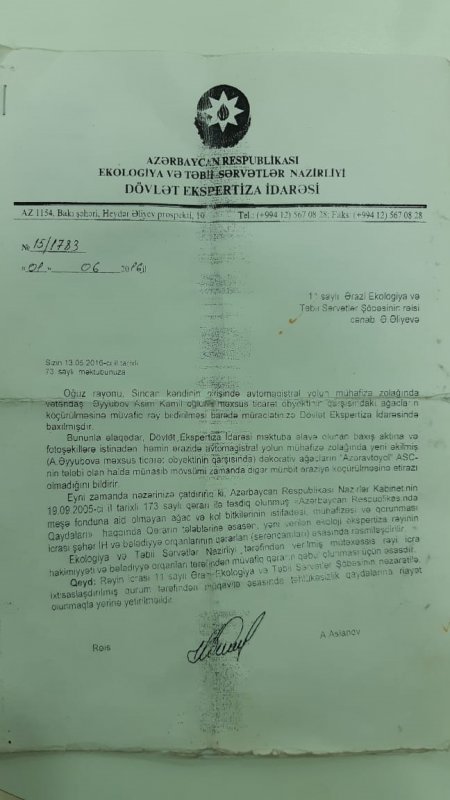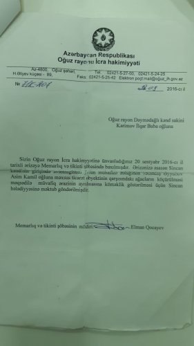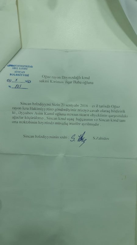 Mən, Oğuz rayonun Sincan kəndinin girəcəyində, Qaraməryəm-İsmayıllı-Şəki avtomobil yolunun 94-cü km-də, sağ tərəfdəki mühafizə zolağından kənarda Gülay osmanovla birlikdə 2014-cü ildən ərzaq marketi inşa etmişik. Lakin bizim marketə giriş-çıxışı əngəlləmək üçün qonşu marketin sahibi tərəfindən gecə içən qanunsuz olaraq dekorativ gül kolları əkilmişdir.Və bu günə kimi də bizi ölümlə hədləyir ki, əkdiyi kolları çıxarsa öldürərəm hamını. Biz də məslənin qanuni həll olunmsı üçün 2016-cı ildən Azəravtoyola” müraciət etdik. Cavab verdilər ki, yaşıllığın köçürülməsi bizim səlahiyyətizidə deyildir. Yerli Sincan Bələdiyyəsi də rəsmən razılıq veribdir ki, kolların məktəb ərazisinə köçürülməsi vacibdir. Oğuz rayon İH-nin Baş memarından da 2014-cü ildən razılıq almışdıq ki, bu ərazidə sahibkar kimi obyekt tikib istifadə edə bilərik.