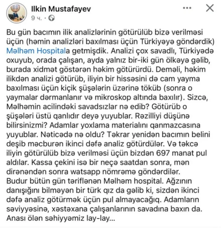 XALQ Ajans.az-a istinadən xəbər verir ki, İlkin Mustafayev adlı Facebook istifadəçisi öz hesabında klinika ilə bağlı narazılığını əks etdirən paylaşım edib.
