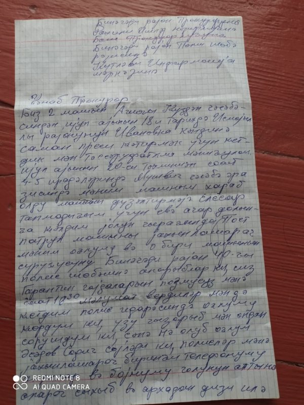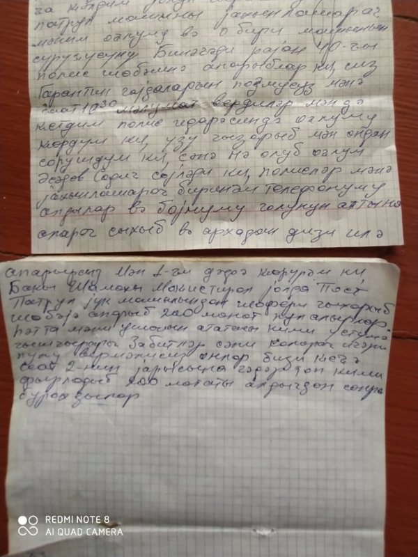 Biz, iki yük maşınıilə iyulun 18-dən Abşeron rayonun Aşağ Güzdək qəsəbəsindən İsmayıllı rayonun İvanovka kəndinə mal-qaramız üçün saman-press gətirmək üçün getmişdik.İyulun 20-də təxminən axşam 4-5 radələrində Müşviq qəsəbə ərazisinə çatanda mənim otla yüklü URAL maşınım xarab oldu.Çlingər tapmadığımdan açarlar üçün evə gəldim. Bu zaman Post Patrul Xidməti maşını yaxınlaşaraq mənim oğlumu və o biri maşının sürücüsünü Binəqədi RPİ_nin 40-cı PB-nə zorla aparıblar ki, siz kaeantin qaydalarını pozmusunuz. Bu barədə mənə axşam 10-30-da məlumat verdilər. Mən də PB-nin qarşısına gəliboğlumu gördüm. Üzü çox qızarmışdı.oruşdum nə olub? Oğlum Əsədov Sadiq dedi ki, PPX polisləri mən maşında olanda yaxınlaşaraq birinci telefonumu zorla aldılar və mənim boynumu qoltuq altına alaraq bərk sıxıb arxadan dizilə təpikurub PPX maşınına basıb aprdılar. Polislər oğluma və o biri maşınn sürücüsünə cərimə yazıblar. Hər üçümüzn cərimə kağızlarını götürüb Müşviq qəsəbəsindəki maşının yanına gəldik. Bu zaman polislər yenidən PPX maşınıilə gəldilər ki, size rəis çağırır. Biz yenidən PB-nə gəldik. Dedilər ki, siz indi bizə ən azı 200 manat pulu verməlisiniz ki, buraxaq. Mən 102 xidmətinə müraciət etim ki, bizə köməklik etsinlər. Sonra evə, yoldaşıma zəng etim ki, 200 mant tpıb göndərsin. Polislər mənə dedilər ki, yenidən 102-yə zəng et ki, şikayətim yoxdur. Pulu alıb bizi buraxdılar. İndi mən bilmirəm qonşulardan borc alınan 200 manat pulu ödəyim, yoxsa maşınımı düzəltdirim? Mən Sizlərdən çox xahiş edirəm ki, Binəqədi polislərinin aldıqları 200 mant pulu geri qaytarsınlar. Ki. maşınımı təmir edib, yükü evimə çatdırım. Binəqədi polis zabitləri utanmadan deyirlər ki, pul yığmaq yuxarıların göstərişidir. Axı biz yük maşımımızla saxladığımız mal-qaraya ot gətirirdik. Buna da iczə verirlər. Bakı şəhərinin kənarındakı karantin postlarında bizim maşınlara ayrıc yol ayırıblar ki, rahat işləyək. Bu ciddi yoxlanışlı postlarda bizə deyən olmur ki., siz karantin vaxtı bu ot preslərini hara aparırsınız? Mən 1-ci dəfə görürəm ki, Şamaxı-Bakı magistral yolunda polisin PPX maşını yük maşınının sürücüsünü boynunu sıxaraq zorla polis şöbəsinə aparıb 200 manat alıb sonra gecə ikinin yarsında evinə buraxsın. Bu özbaşnalığın adı nədir?