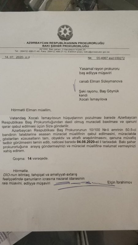 Baxmayaraq Ki, bizim şikayətimiz əsasında Baş Prokuror cənab Kamran Əliyev 2 ay əvvəl şikayətin araşdırılması üçün 10/100 saylı əmrinin 50.5-ci bəndlərinin tələblərinə əsasən qanuna müvafiq tədbirlərin görülməsinin təmin edilməsi barədə göstəriş verməsinə baxmayaraq nədənsə tədbir görülmür. Konkret olaraq Bakı şəhər Prokurorluğnun bizə və Yasamal rayon Prokuroruna ünvanlanan 14 iyul 2020-ci il tarixli məktubda qeyd edilir: “Vətəndaş Xocalı İsmayılovun hüquqlarının pozulması barədə Baş Prokurorluğa daxil olmuş müraciəti baxılmsı və qanuni qərar qəbul edilməsi üçün Sizə göndərilir.