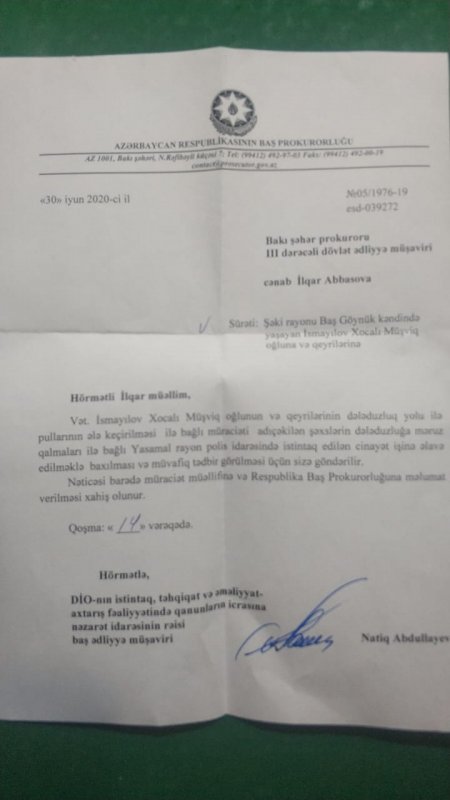 Şəki rayonun Baş Göynük kəndində qeydiyyatda olan və faktiki yaşayan İsmayılov Xocalı Müşviq oğlu, Həmidzadə Təhmasib Məmməd oğlu, Abdurahmanov Anar Altay oğlu tərəfindən dövlət başçısına, Baş nazirə, Baş prokurora, Daxili İşlər nazirinə, Ombudsman Aparatının sədrinə və digər aidiyyatı qurum rəhbərlərinə, eləcə də bir nüsxəsi ifadetv.com saytına ünvanlanmış müraciətdə “ Bizim dələduzluğa məruz qalmağımızla bağlı Yasamal RPİ-də 11 aydır ki,istintaq edilən cinayət işi üzrə Baş Prokurorun 10/100 nömrəli, 30 iyun 2020-ci il tarixli əmrinin yerli prokuror tərəfindən dərhal icra olunması” barədə ərizədə bildirilir: