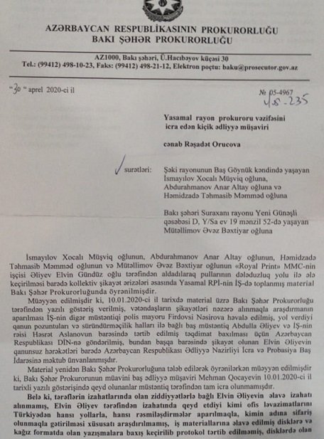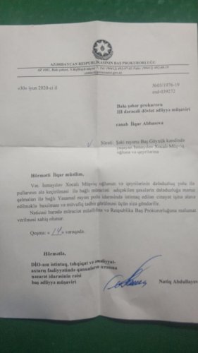 Bununla bağlı Bakı şəhər Prokurorluğunun DİO istintaq, təhqiqatın icrasına nəzarət idarəsinin rəisi cənab Elnur Cəfərovun Yasamal Rayon Prokuroruna ünvanladığı 30 aprel 2020-ci il tarixli Yasamal Prokuroruna göndərdiyi məktubunda bildirilir: