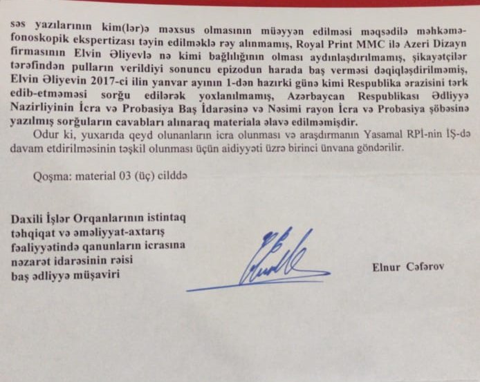 Belə ki, tərəflərin izahatlarında olan ziddiyətlərlə bağlı E.Əliyevdən izahat alınmamaış, E.Əliyev izahatında qeyd edildiyi kimi, ofis ləvazimatlarını Türkiyədən hansı yollarla, hansı rəsmiləşmələrlə, kimin adına sifariş olunmaqla gətirilməsi xüsusatları araşdırılmamış, iş materiallarına əlavə edilmiş disklərə və kağız formatda olan yazışmalara baxış keçirib protokol tərtib edilməmiş, disklərdə olan səs yazılarının kimə məxsus olmasının müəyyən edilməsi məqsədilə məhkəmə-fonoskopik ekspertiza təyin edilməklərəy alınmamış, “Royal Print” MMC ilə “Azeri Dizayn firmasının Elvin Əliyevlə nə kimi bağlılığı olması aydınlaşdırılmamış, şikayətçilər tərəfindən pulların verildiyi sonuncu epizodun harda baş verməsi dəqiqləşdirlməmişdir. Elvin Əliyevin 2017-ci ilin yanvarın 1-dən hazırkı günə kimi Respublika ərazisini tərk edib etməməsi sorğu edilərək yoxlanılmamış, AR Ədliyyə Nazirliyinin İcra və Probasiya Baş İdarəsinin Nəsimi rayon İcra və Probasiya şöbəsinə yazılmış sorğuların cavabları alınaraq materiala əlavə edilməmişdir.
