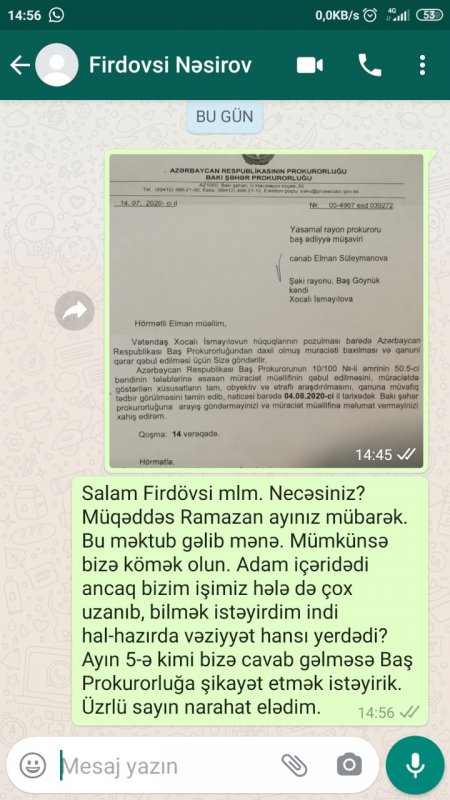 Bu arada, bizim şikayətimiz əsasında Baş Prokuror cənab Kamran Əliyev 2 ay əvvəl şikayətin araşdırılması üçün 10/100 saylı əmrinin 50.5-ci bəndlərinin tələblərinə əsasən qanuna müvafiq tədbirlərin görülməsinin təmin edilməsi barədə Bakı Şəhər Prokurorluğuna rəsmi göstəriş vermiş və dərhal da konkret olaraq Bakı şəhər Prokurorluğnun bizə və Yasamal rayon Prokuroruna ünvanlanan 14 iyul 2020-ci il tarixli məktubda qeyd edilir: “Vətəndaş Xocalı İsmayılovun hüquqlarının pozulması barədə Baş Prokurorluğa daxil olmuş müraciəti baxılmsı və qanuni qərar qəbul edilməsi üçün Sizə göndərilir.