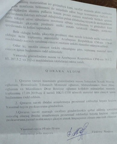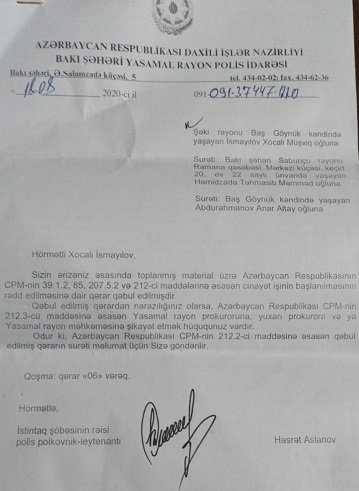 Bakı şəhər prokurorunun müavini cənab M.Qocayevin yazılı təqdimatında qeyd edilən xüsusatlar müstəntiq F.Nəsirov tərəfindən araşdırıldıqdan sonra 06 mart 2020-ci ildə toplanmış materialların öyrənilməsi və cinayət işinin başlanması məsləsinə baxılması üçün Yasamal Rayon Prokurorluğuna göndərilmişdir. Bu barədə Yasamal RPİ-nin İstintaq Şöbəsinin 15 aprel 2020-ci il tarixli cavab məktubu əlavə edilir.