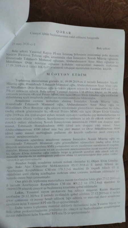 “ İsmayılov Xocalı, Abdurahmanov Anar, Həmidzadə Təhmasib və Müttəlimov Əvəz “Röyal Print” MMC-nin işçisi Əliyev Elvin tərəfindən aldadılaraq pullarının dələduzluq yoluilə ələ keçirilməsi barədə kollektiv şikayəti ərizələrinə əsasında Yasamal RPİ-nin İŞ-də toplanmış material Bakı şəhər Prokurorluğunda öyrənilmişdir.