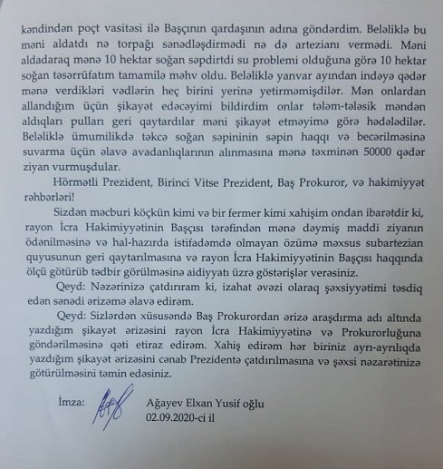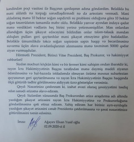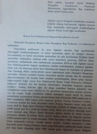 Ağdam rayonundan olan məcburi kökçün Ağayev Elxan Yusif oğlu Ağdam rayon İcra hakimiyyətinin başçısı Vaqif Həsənovun qanunsuz hərəkətlərindən Prezidentə, 1-ci vitse-prezidentə və Baş prokuror Kamran Əliyevə ünvanladığı şikayətdə göstəriri ki, o uzun müddətdir ki,bir fermer olaraq rayonda heyvandarlıq və kənd təsərrüfatı məhsulları istehsal edib xarici bazarlara çıxarıb satmaqla məşğul olub. Bu arada ona məxsus olan və 2003-cü ildən istifadəsində olduğu subartezyan quyusunu məcburən, hədə-qorxuilə İcara başçısı Vaqif Həsənov ondan alaraq kəndlisi və yaxın qohumu olan Hətəmov Baxşeyişə vermişdir. Bir müddət sonra İcra başçısı özünün doğma qardaşı Namiq Həsənov vasitəsilə Elxan Ağayaevə xəbər göndərmişdir ki, 5000 manat pulu subartezyanın qaytarılması üçün və qohumu Hətəmov Baxşeyişə məxsus olan 32 ha torpaq sahəsini satın alması üçün əlavə 21000 manat pul versin. E.Ağayev əvvəlcə subartezyan quyusunun geri qaytarılması üçün ondan tələb olunan 5000 manat rüşvəti tapıb başçının qardaşı N.Həsənova versə də, sonra 32 ha torpağa görə də məcburi istənilən 21000 manat pulu hissə - hissə ödəmişdir. Lakin Vaqif Həsənov nə subeartezyan quyusunu qaytarmış, nə də vəd verilən torpağın sənədləşmə işlərini icra etməmişdir. Və nəticədə, fermerin 10 ha ərazidə əkdiyi soğan məhsulu susuzluqdn tamamilə məhv olmuşdur. Bundan əsabləşən məcburi kökçün E.Ağayaev şikayət edəcəyini bildirən kimi, icra başçısı V.Həsənov ondan aldığı cəmi 25000 manat rüşvəti tamamilə ona qaytarmışdır. Ona görə də, E.Ağayev portalımız vasitəsilə yuxarı instansiyalara şikayət edərək ona icra başçısı Vaqif Həsənov tərəfindən dəymiş 50000 manat maddi ziyanın ödənilməsini tələb edir.