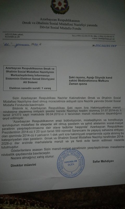 Əvvəlki məktublarıma pis-yaxşı Şəki icra Hakimiyyəti Aparatının təsərrüfat şöbəsinin məsləhətçisi səviyyəsində mənə rəsmi formal cavab yazılır ki,”Növbəniz çatanda mənzillə təmin olunacaqsınız.” Görün nə qədər bəsit, quru, cansıxıcı, bürokrat və vicdansız bir cavabdır. Bu bürokratlar şəhid mənzillərini alver predmetinə çeviriblər Və görürəm ki. heç bir tədbir görmək niyyətləri də yoxdur. Elə bil mən bunların dədələrindən ev istəyirəm. Son məlumata görə 3 aydır ki, Şəki rayon və mərkəzində mənim kimi şəhid və Qarabağ müharibə əlilləri üçün 20 ədəd mənzil tikintisinə start verilmişdir.Və işlər sürətlə davam etdirilir. Nazirliyin bürokratı Abdullayev isə mənə cavab veriri ki, 2028-ci ilə kimi mənzillə təmin olunacaqsınız.
