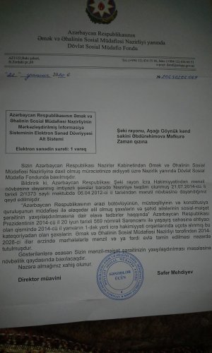 mənim sonuncu müraciətimdən sonra yerli bələdiyyə sədrinin dediyinə görə Sosial Təminat Nazirliyindən Sizə həyət evi tikmək üçün göstəriş gəlib. Əvvəlcə bu il avqustun 14-də gəlib evimizin uçuq-sökük yerlərinin fotolarını çəkib getdilər. 2 gün sonra ƏƏSMN-nin Şəki Rayon İdarəsinin əməkdaşları gəlib yenə hazırda yaşadığımız 28 kv.m sahəsi olan təmirsiz evimizin və əvvəlki uçuq daxmamızın şəklini çəkib getdilər. Bu məmur dəstəsi iş görmək əvəzinə bizim vaxtımızı alır fotosessiya edib gedirlər. Ki, Nazirlikdən tapşırıq var ki, biz faktı yerində araşdırırıq. 26 ildir dövlətdən yalnız gözlədiyim bu evdir Bunu da yerli süründürməçi məmurlar çox görürlər. Mən də dediyərm ki, sizi bura göndərən məmurların milyonluq villaları var. Hansı ki, Azərbaycan Həmkarlar Konfederasiyasınının «Turbaza» adlanan dövlət torpağını zəbt edib tikmiş qəsrlərinin şəkillərini çəkin. Və bu bədbəxtlərdən soruşun ki, dövlətə məxsus torpaqda qanusuz tidirdiyiniz və qanunsuz sənədləşdirdiyiniz milyonluq villaları hansı alın tərilə yaratmısınız?. Mənim oğlum sizin kreslolarda rahat oturmaq və "çirkli pullar" qazanaraq villalar tikməyiniz üçün şəhid olmayıb ki, sizlər məni süründürməçiliyə salasınız.