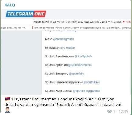 Şəkildən də görürsünüz ki, Hayastan Ümumierməni Fonduna 100 milyon dollar köçürənlər sırasında əziz əliyevin başçılıq etdiyi “Sputnik Azərbaycan”ın da adı var.