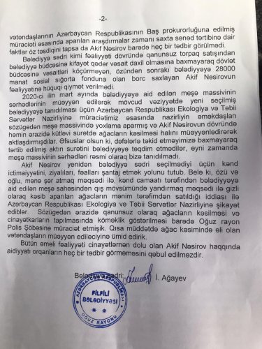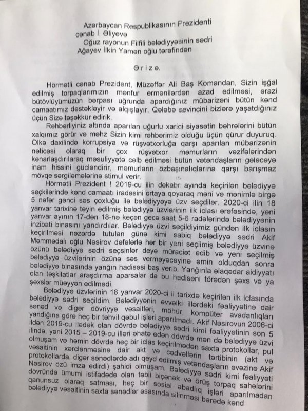 Hörmətli, Prezident! 2019-cu ilin dekabrında keçirilən bələdiyyə seçkilərində kənd camaatı iradəsini ortaya qoyaraq məni və mənimlə birgə 5 nəfər gənci səs çoxluğu ilə bələdiyyə üzvü seçdilər. 2020-ci ilin 18 yanvar tarixinə təyin edilmiş bələdiyyə üzvlərinin ilk iclası ərəfəsində, yəni yanvar ayının 17-dən 18-nə keçən gecə, saat 5-6 radələrində yerli bələdiyyənin inzibati binasını yandırdılar. Bələdiyyə üzvü seçildiyimiz gündən ilk iclasın keçirilməsi nəzərdə tutulan günə kimi sabiq bələdiyyə sədri Akif Məmmədəli oğlu Nəsirov dəfələrlə hər bir yeni seçilmiş bələdiyyə üzvünə özünü bələdiyyə sədri seçsinlər deyə müraciət edib və yeni seçilmiş bələdiyyə üzvlərinin özünə səs verməyəcəyinə əmin olduqdan sonra bələdiyyə binasında yanğın hadisəsi baş verib. Yanğınla bağlı araşdırma aparılsa da bu hadisəni törədən şəxs və ya şəxslər nədənsə bu günə qədər müəyyən edilmədi…