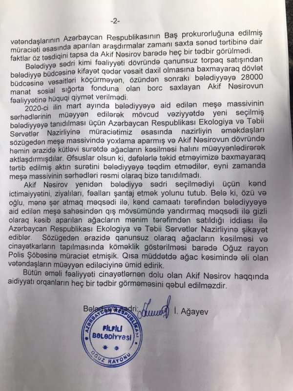 Cənab Prezident ! Odur ki, son ümid yeri olaraq şəxsi nəzarətiniz altında son 15 il Oğuz rayonun Filfili kənd Bələdiyyəsinin sədri olmuş Akif Nəsirovun işlədiyi dövrdə törətdiyi qanunazidd əməllərin araşdırılmasına göstəriş verməyinizi xahiş edir və əvvəlcədən təşəkkürümüzü bildiririk.