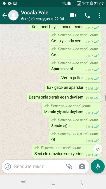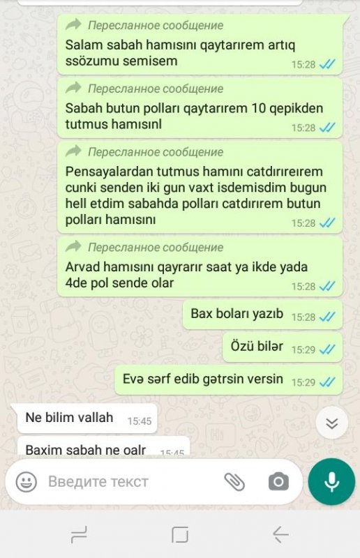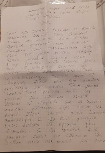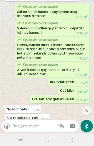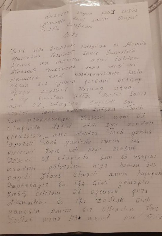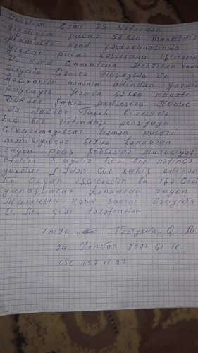"Bildirim ki, Mamusta kənd xəstəxanasında işləyən əmim qızı olan Abbasova Gülbahar Xahəsən qızı mənə bildirdi ki, o rəhmətlik Rövşən Lənkəranskinin anası Hacıxanım ananın yanında katibə kimi də işləyirmiş. Onun köməkliyilə atanın, əminin və diggər tanıöın adamların əlillik pensiyasına çıxmaq, işə düzəlmək kimi problemlərini çox asan həll edə bilir. İlk növbədə atam Mirahilin ciddi xəstəliyinə görə onunla 2000 manat adanışdım. Və əvvəlcə 1000 manat, daha sonra da 1000 manat verdim. Sonra qardaşım Əhmədağanın da pulunu ürək xəstəliyindən pensiyaya çıxmağa görə verdik.Sonra bacım Mirvarinin də beləcə pulunu verdik. Gülbahar bu pulları işlədiyi xəstəxanada baş həkim Şakirə, Talehə və Könülə verərək işi düzəldəcəyini bildirmişdi. Beləliklə bütün ciddi xəstə olan qohum-əqrəbadan –cəmi 29 nəfərdən əlillik pensiyası və iş düzəltmək adı ilə mənim yanımda Gülbahara cəmi 52800 manat pul verdik. Lakin aradan 8 ay keçdi. O əvvəlcə izah etdi ki. baş həkim sənədləri təsdiq etdirmək üçün yuxarılara verib. Amma Koronavirus vaxtı olduğuna görə işlər uzanır. İşi belə görüb əvvəlcə Hacıxanımın evinə getdim. Dedilər hacıxanım ana 1il aydır ki, burada yaşamır, Bakıda olur. Ona görə də Polis Şöbəsinə gəlib şikayət ərizəsi verdim. DİN-nin 102 xidmətinə də bu barədə şikayət etmişdim. İşə əvvəlcə Elvin adl müstəntiq baxırdı. Sonra o heç bir tədbir görmədiyindən işi ondan alıb başqasına verdilər. Düz 3 aydır ki, Lənkəran Polis Şöbəsi mənə heç bir cavab vermir. Amma bir dəfə polisdə olanda polislər gülbahar haqqında dedilr ki, o adam öz evindən oğurluq etdiyinə görə də izahatı alınıb.gülbaharla mənim aramd çoxsaylı SMS yazışmalar varki, pulun alınması, kimə verilməsi hamısı olsa da polis buna əhəmiyyət vermir. Məsələn şəhid ailəsi var ki, onlardan 12100 manat pul almışindi,dı oğluu yaxşı işə düzəltmək adıilə Amma sonra həmin oğlu müharibədə şəhid oldu. Heç onun da pulunu insafları olub qaytarmırlar ki, ailə onsuz da bədbəxt olub.Bu gün bütün ziyana düşən qohum-əqrəba deyir ki, Qızvst biz biliri ki, burda sənlik bir şey yoxdur. Biz sənin yanında pulu Gülbahara vermişik. O da aydın olub ki, yaşadığı evi Gülbahar supper təmir etdirib, qalan pulları da baş həkim və Talehlə bölüblər.Sən şikayət et biz hamılıqla səni müdafiə edəcəyik, şahid ifadəsi verəcəyik.Qorxma. Bir tərəfdən polisin xəstəxananın baş həkimi Şakiri, Gülbaharı izahat vermək üçün dəvət etməsindən sonra onlar məni xəstəxanaya çağırıb hədə-qorxu gəlməyə başladılar. Gülbahar dedi ki, əgər bir də Şakirin, Talehin, Könülün adını polisə versən sənin uşağın 1 iynənin qurbanı olacqdır. Heç bilməyəcəksən hansı həkimin əlilə olub. Mən bu hədləmələr haqqında Ləçkəran polis Şöbəsinə, İcra Hakimiyyətinə, ərazi kənd nümayəndəsinə, DTX-ya müraciətlər etmişəm. Təkcə İcra hakimiyyətinin hüquqşünası yazır ki, get Lənkəran ŞPŞ-nə və ya Lənkəran Prokurorluğuna müraciət et. Bundan sonra baş həkim Şakir məni öz otağına çağıraraq hədə-qorxu gəldi ki, talehin adını çəksən o səni məhkəməyə və prokurorluğa verəcək.O məni həkim Talehin yanına apararaq səsimi gizli yazdı və şərlədi. Gülbahar isə mənə ayrıca narkoman dayısıilə hədlədi ki, səni məhv etdirərəm. Məm xəstə oğlumla 113 manat pulun ümidilə yaşayırıq. Camaatın pulunu mən qaytara bilmərəm.