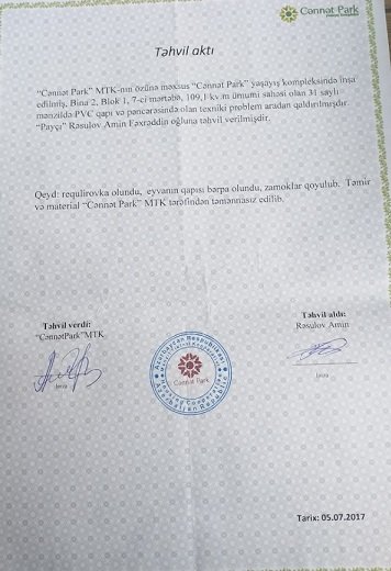 Bir daha qeyd edirəm ki, MTK rəhbərliyinin məndən kommunal xidmət adı altında tələb etdiyi 1003 manat pul qanunsuz istənilir. Çünki mən son 3 ili yaşamamışam. İndi bu bəhanə ilə məni nə mənzilə buraxmırlar, nə də təmir etdirib yaşamağıma imkan vermirlər. ASAN xidmətin verdiyi məlumata görə isə qaz sayğacına görə rüsum haqqı 262 manat, su sayğacına görə isə pilsuz dur. Buna baxmayaraq MTK rəhərliyi bütün sakinlərdən qanunsuz olaraq dələduzluq yoluilə hər bir mənzilə görə 490 manat artıq pul yığmaqla cinayət törətmişlər. Mən də bu pulun yalnız dövlət rüsumunu ödəməyə hzır olduğumu bildirsəm də rəhbərlik razılıq vermir.