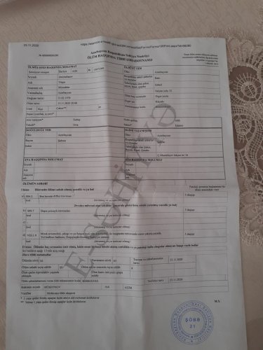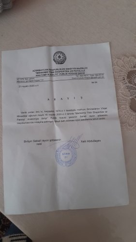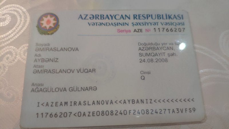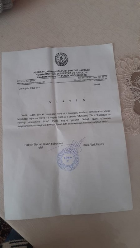 Sonradan eşitdik ki, keçmiş ərim Vüqar Əmiraslanov bakının Qaradağ rayon ərazisində, “Meyvəli” adlanan ərazidə Zaur adlı ( mob tel. 055-2333395) minik avtomobili sürücüsü tərəfindən vurularaq ölmüşdür. Sürücü Vüqarın ata evi olan Dəvəçiyə getmiş və 8000 manat yardım etmişdir. Çox təəssüf ki, Vüqarın qardaşları bu pulu bölüşdürüb mənimsəmiş, onun yetim qalmış qız övladı olan Aybənizə isə 1 qəpik də verməmişlər. Aybəniz mərhum atasının varisi olsa da, ona ata yurdundan da pay təklif etmirlər. Hazırd biz Sumqayıt şəhərində atama məxsus evdə yaşayırıq. Baxmayaraq ki. gəlin köçdüyüm Vüqarın Dəvəçi şəhəri, Ç.Mustafayev küç. Ev 16-da ata evində yaşadığımız vaxt cehizlərimin hamısı otaqda qalmışdır. Onu da vermirlər. Hal-hazırda vüqarın ölümünə səbəbkar oolan sürücü Zaur isə öz məhkəmə işlərini qydasına sldıqdn sonra Qəzda vəfat etmiş Vüqarın ölümünə görə Dövlət Sığorta Kommersiya şirkətindən düşən 5000 manat pulu özü alıb xərcləmək istəyir. Adını da qoyur ki, qəza törədən zman işin bağlanması və Vüqarın ailəsinə yardım verməklə çox ziyana düşübmüş. Axı qəzada ölən şəxsin övladı olan 13 yaşlı qızı bu gün əziyyət çəkir. Niyə sığorta ödənişi ona verilməməlidir? Niyə atasının ölümünə görə ona 18 yaşınadək dövlət verdiyi təqaüdü ala bilməməlidir? Çünki atasının ölüm şəhadətnaməsinin alınmasına yaramaz əmiləri çox biganə yanaşırlar. Amma ortalıqda bu ölüm faktını təsdiq edən Səhiyyə Nazirliyinin verdiyi 23 noyabr 2020-ci il tarixli Ekspert rəyində “Ölüm haqqında tibbi şəhadətnamə” var.