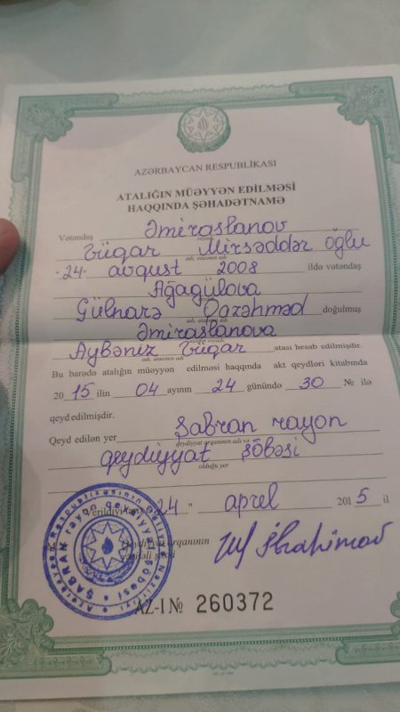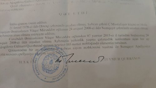 " Əvvəlcə bildirim ki, mən keçmiş həyat yoldaçım olan mərhum Əmiraslanov Vüqar Mirsəddər oğlu ilə 2007-ci ildə toy edərək ailə qurmuşduq. 2008-ci ildə Aybəniz adlı bir övladımız olmuşdur. 2014-cü ilədək əvvəlcə Vüqarın qeydiyyatda olduğu və yaşadığı ata evi olan Dəvəçi şəhəri, Ç.Mustafyev küçəsi , ev 16-da yaşadıqdan sonra Sumqayət şəhərinə gəlib yaşamışdıq. 2014-cü ildən Vüqar bizi ataraq rayona ata evinə gedib 2020-ci ilədək yaşamışdır. Ona görə də bizim birgə nikahımız olmadığına görə qızıma atalığın müəyyən edilməsi və alimentin verilməsi barədə Şabran rayon Məhkəməsində 2014-cü ildə iddia ərizəsi verdim. Ərizəm hakim Teymur Qurbanov tərəfindən bxılaraq qismən təmin edildi. Və Dəvəçi rayon Qeydiyyat şöbəsi tərəfindən 2015-ci ildə qızım Aybənizə “Atalığın müəyyən edilməsi haqqında rəsmi şəhadətnamə verildi.Eyni zamanda Şabran rayon məhkəməsinin qətnmasinə görə 01 yanvar 2015-ci ildən etibarən 103 manat pulun aliment olaraq ödənilməsi qət edilmişdir. Lakin son 5 il ərzində atası Vüqar yalnız bir dəfə 100 manat aliment ödəmişdir. Dəvəçi İcra Şöbəsi Məhkəmə qətnaməsini nədənsə icra etməmişdir.