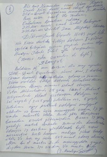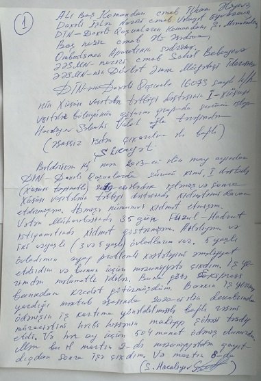 Ali Baş Komandan olaraq sizə müraciətlə xahiş edirəm ki, h\hissə komandiri tərəfindən barəmdə saxta və əsassız ittihamarla bağlı işdən azad edilməyim üçün yazılıb DİN –nin Daxili Qoşunlar Komndanına təqdim edilmiş təqdimatda qeyd edilən məlumatların heç bir qanuni əsası olmadığına görə verilmiş ƏMRin ləğv olunmasına göstəriş verəsiniz ki, mən ailəmi dolandırmaq üçün Milli Orduda Vətənə xidmətimi davam etdirə bilim."