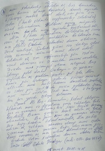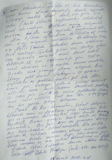 Cənab Ali Baş Komandan bilin ki, xidmət etdiyim hərbi hissədə mənə və digərlərinə qarşı rəhbərliyin belə pis və qanunsuz davranışlarından şəxsi heyət tamamilə bezdirib. Bunun qarşısı hesab edirəm ki, təcili alınmalıdır. Yoxsa gec olacaq. Budur martın 9-dan bu günədək mənə qanunsuz olaraq heç bir son hesablaşmam və əmək haqqı pulum verilməyib.