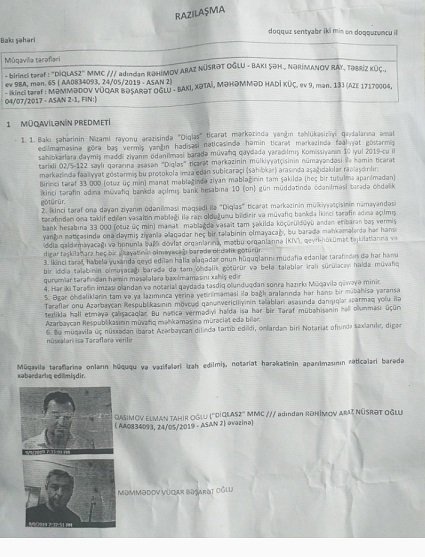 "11 ildir ki, Bakının Nizami rayonunda yerləşən “Diqlas” ticarət mərkəzində bir şbəni götürüb xırda ticarətlə məşğul olurdum. Məlum 2019-cu ilin mart yanğınından sonra bu ticarət mərkəzindəki bütün əmlakımız tam yandı.Və bizə cəmi 35000 manat təzminat ödənildi. Mən bu pulla yenidən ir ticarət yeri açmaq üçün əvvəlcə işlədiyim yerə yaxın olan “Diqlas” TM-nin arxasındkı Nizami rayonu üzrə Qarabağ Əlillər Cəmiyyətinə məxsus- balansındakı istifadəsiz qalmış, təmirsiz, dağlıb –tökülən 18x13m ölçüdə olan boş ərazidə yenidən bir ticarət obyekti açıb işlətmək üçün əlimdə olan nağd 41520 manat pulu buranın tikintisinə yatırdım. Və məsləhət gördülər ki, əvvəllər bu ərazidə alverdən yığılan pulların qazancı olaraq əlillər Cəmiyyətinə yer sahibi kimi hər ay 1000 manat pul köçürürdülər. Mən də istədim ki, burada yenidənqurma işləri apardıqdan sonra Cəmiyyətə hər ay ən azı 5000 manat ödəyim. Ona görə də tikinti işləri tamamlandıqdan və istifadəyə verildikdən sonra Cəmiyyətin hesabına köçürülüməsi üçün Cəmiyyətin nizami rayonu üzrə sədr müavini olan İzzət Şirinov adlı şəxsə hər ay olaraq nağd pul verirdim. Qeyd edim ki. burada yenidən dəmir konstruksiyalar, asfalt, taxta, dəmir və plastik materiallardan istifadə etməklə 13 ədədə xırda ticarətotağı yaratmış, 2-ci mərtəbədə isə 2 otaqlı ofis yeri yaratmışdım. Mən cəmiyyətin sədr müavinilə ayı 5000 manat icarə haqqını şifahi razılaşma əsasında 3 ay özüm tək işləyib ödədim. Bundan əlavə isə mənə düşən qazancdan İzzətə də verirdim ki, gələn qazancda onun gözü qalmasın. Lakin buna baxmayaraq 22 marta qədər belə işlədim. 22 mart günü isə İzzət ofisə gələrək bildirdi ki, “Vüqar sənin burada heçnəyin qalmayıb.açarları ver, özün də çıx get evinəvə bir daha buralarda görünmə” Mən şoka düşdüm və etiraz etdikdə isə iki dəfə ağır çəkisinə görə qəfil olaraq möhkəm yumruq zərbəsilə ürəyimin üstündən vurdu. Bir anlıq zərbədən hüşümü itirdim. Açarları vermədən çıxıb evə getdim. Qeyd edim ki, 22-də işə gələndə ofisdə bütün hesab kitablarım, sənədlərimin hamısını İzzət məndən soruşmadan oğurlayıb aparmışdır. Soruşandad abildirdi ki, guya baş idarədən istəyiblərmiş.