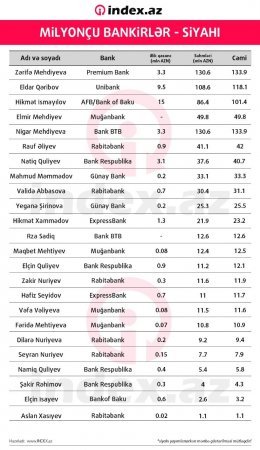 Index.az iqtisadayyat, maliyyə və biznes portalı Azərbaycanın rəsmi milyonçularının siyahısını tərtib edib. Söhbət bankların və sığorta şirkətlərinin səhmdarlarından gedir. Qeyd edək ki, yalnız bank və sığorta sektorunda hesabatlılığın əlçatan olması araşdırmaya təsirsiz ötüşməyib.
