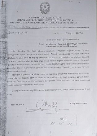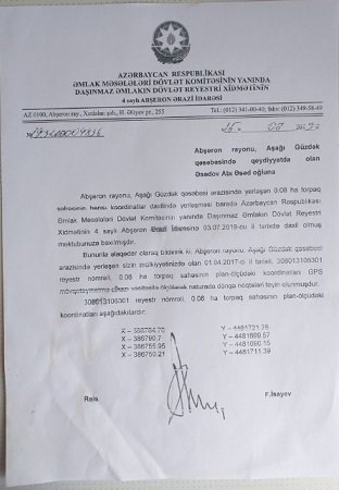 Onu da xatırlatmaq yerinə düşərdi ki, mübahisəli ərazidə 2016-cı ildən ev tikib yaşayan və 3-cü şəxs olan Ariz Almazov Qobustan rayonunda pasport qeydiyytındadır. Və bu şəxsin Aşağı Güzdək Bələdiyyəsindən torpaq almaq imkanı qanunvericiliklə tənzim olunmur.