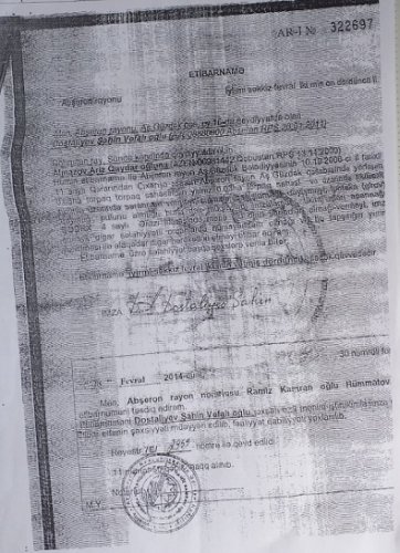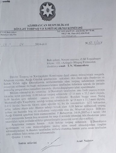 Bu rəsmi sənəd bir daha təsdiq edir ki, mübahisələndirilən sahə Ş.Dostəliyevə deyil, mənə məxsusdur. Və Ş.Dostəliyevin mənə məxsus 0.08 ha torpaq sahəsini mübahisələndirmək üçün əlində heç bir maddi sübutu yoxdur. Lakin nə hakim C.Məmmədov, nə də hazırda Apellyasiya məhkəmə hakimi H.Babayeva bu rəsmi sənədi də nəzərə almaq istəmirlər.