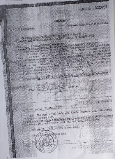3. Məhkəməyə etibarnamə əsasında mənə məxsus torpağı Ariz Qaydarova satdığına görə onu da 3-cü şəxs kimi Şahin Dostəliyev və Ariz Almazov məhkəməyə cəlb edilmişlər. Onların məhkəmədən əsas tələbi də budur ki. guya mənim mülkiyyətimdə olmuş 0.08 ha torpaq sahəsi Ş.Dostəliyevə məxsus olubmuş. Baxmayaraq ki, iddiaçı subyektiv hüququnun olmasıilə bağlı məhkəməyə heç bir sübutedici fakt təqdim etməmişlər. Lakin buna baxmayaraq məhkəmə yalnız tərəfin uydurduğu mülahizə əsasında qanunsuz və əsassız qarar çıxarmaqda maraqlı olmuşdur. Məlumat üçün bildirim ki, Ş.Dostəliyevin, nə də Ariz Qaydarovun mənim 2000-ci illərin əvvələrindən istifadəmdə olmuş bu yerə aidiyyatı olmamışdır. Və bu yerin əldə edilməsi üçün 11 may 2005-ci ildən Yerli bələdiyyəyə rəsmi ərizə ilə müraciət etmişdim.və 2007-ci ildən bu 0.08 ha ərazi Bələdiyyə tərəfindən bütün sənədlərlə birlikdə mənə rəsmən verilmişdir. Qonşum olan Ş.Dostəliyev də 1 il sonra,2006-cı ildə qonşuluqda yerli Bələdiyyədən 0.08 ha sahə almışdır. Lakin o vaxtdan mənim istifadəmdə olmuş bu əraziyə də iddialı çıxış edərək guya ona məxsus olduğunu və əlində sənəd olduğunu bildirmişdir. Və o zorakılıla heç nəyə əhəmiyyət vermədən özünə qonşulqda ayrılan 0.08 ha bələdiyyə torpağıilə yanaşı mənə verilən 0.08 ha sahənin 0.033 ha-nı zorakılıqla yaxın adamı olan və hazırda 3-cü tərəf kimi çıxış edən Ariz Qaydarova öz mülkiyyəti kimi savadı olmayan şəxsə aldadaraq qanunsuz satmış və bircə 24 fevral 2014-cü il tarixli saxta etibarnamə verməklə 6500 manat pulunu alıb mənimsəmişdir.
