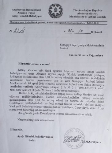 4. Və təqdim edilmiş sübutlara və sənədlərə əsasən dəqiqləşdirmədi ki, Şahin Dostəliyev 09.10.2019-cu il tarixli Aşağı Güzdək Bələdiyyə sədri tərəfindən Sumqayıt Apellyasiya Məhkəməsinin hakimi xanım Gülnarə Tağızadəyə ünvanlanmış rəsmi məktubunda qeyd edilir ki, Abı Əsədova və Şahin Dostəliyevə hər birinə 0.08 ha torpaq sahəsi ayrılmışdır.”