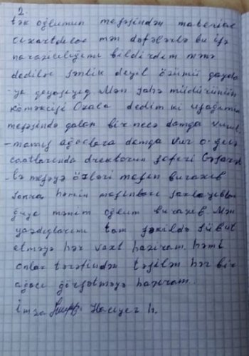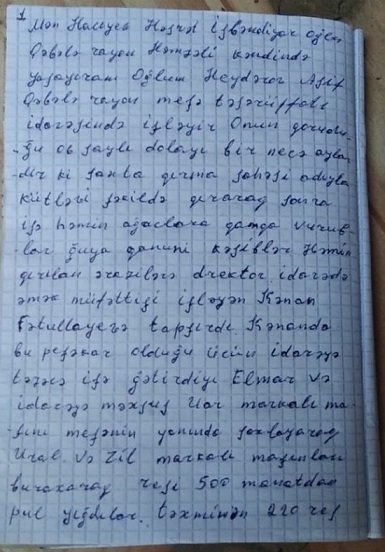 Çoxhörmətli cənab Prezident İlham Əliyev! Mən, Qəbələ rayonun Həmzəli kəndində yaşayıram.Oğlum Asif Heydərov Qəbələ rayon Meşə Təsəsrrüfatı İdarəsində işləyir.Onun qoruduğu 06 saylı dolayı bir neçə aydır ki, saxta qırma sahəsi adıyla küləvi şəkildə qırır və sonra isə həmin ağacların kötüyünə damqa vururlar. Guya ki. ağaclar qanuni odun üçün kəsilibmiş. Həmin qırılan ərazilərədə bu işi direktor, idərədəki əmək müfəttişi işləyən Kənan Fətullayevə tapşırırdı. Kənan da bir peşəkar olduğu üçün idarəyə təzəcə işə gətirdiyi Elmar adlı qohumunu və idarəyə məxsus UAZ markalı maşını meşənin yanında saxlayaraq URAL və ZİL markalı maşınları ağac kəsib daşımaq üçün meşəyə buraxaraq hər maşın reysi üçün 500 manatdan pul yığdırırlar. Təxmininən son aylarda bu vaxta kimi 220 reys material ( hər URALa ən azı 10 kub m material yığmaqla) tək oğlumun meşəsindən odun adı altında materialı çıxarıb daşıyıb satıblar. Mən dəfələrlə bu işə öz narazılığımı bildirsəm də Kənan və direktor mənə bildirmişlər ki, sənlik deyil, özümüz qaydasına qoyacağıq. Mən meşə sahə müdirinin köməkçisi Özala dedim ki, oğlumun gözətçisi olduğu meşədə qalan bir neçə daqa vurulmamış ağaclara da damqa vurmaq vur. O gecə saatlarında direktorun ( Alim Əlizadə) şoferi Cəsarətlə meşəyə özləri qəsdən maşın buraxıb sonra həmin maşını da özləri saxlayıblar. Guya mənim oğlum bu maşını meşəyə buraxdırıbmış.Amma teatr qurublar. Mən bir peşəkar meşə işçisi kimi yazdıqlarımı tam şəkildə sübut etməyə hər vaxt hazıram. Həm də idarə rəhbərliyi tərəfindən kəsilən hər bir ağac kötüyünü dəqiq göstərməyə hazıram. Bu hal bütün meşələrdə də baş verməkdədir.