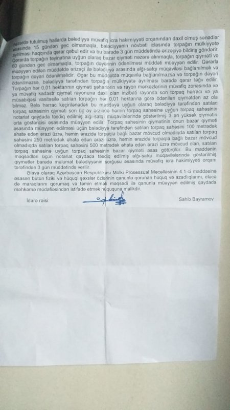 Hörmətli cənab Prezident, bir daha xatırlatmaq istəyirəm ki, 2006-cı ildə kənd sakinlərinə 8 sot olmaqla 300 manat rüsum müqabilində bələdiyyə torpağı verilərkən, Mən 20 sot üçün 800 manat rüsum pulunu Texnika Banka Qobu bələdyyəsinin hesabına köçürmüşdüm. Və mənə bildirmişdilər ki, sənə ən yaxşı yerdən “Çənlibel” restoranının yanından torpaq verəcəyik. Sonra məlum oldu ki, mənə verilən yeri Bələdiyyə başqasına pulla satıb. Sonra yenə söz verdilər ki, ayrı-ayrı yerlər olmaqla sənə 2 pay 10 sot yer verəcəyik. Doğrudur, mənə bir 10 sotluq yeri Qobu Bələdiyyəsinin yerquruluşu planından çıxarış əsasında göstərsələr də sənədə nə möhür vurulub, nə də Abşeron rayon İH-nin indi həbsdə olan Memarlıq Şöbəsinin müdiri Akif Əliyev,nə də Qobu Bələdiyyə sədri Araz Nəcəfov imza edib. Bu fırıldaqçılar uzun müddətdir ki, mənə saxta sənəd verib bürokrat kimi süründürürlər. İndilər də isə mənə məlum olub ki, bu korrupsiyalaşmış dəstənin mənə verdiyi çıxarış sənədində göstərilən yer örüş sahəsi imiş. Burada hər hansı ev tikmək qadağandır.Yəni bələdiyyə sədri bələdiyyə torpağı olmayan yeri qanunsuz olaraq bələdiyyə adı altında saxta sənədlərlə mənim kimi yerli sakinlərə sırımaq və pul qaznmaq istəyir. Mən ev tikmək üçün 800 manat pulu yerli bələdiyyəni hesabına 15 il əvvəl köçürmüşəm. Bu dəstə məndən əlavə olaraq sənədlərin düzəlməsi üçün tələb etdiyi 3000 manatı bir, keçən ildə 3500 manat ( cəmi 6500 manat olmaqla) kapital Bankdan kredit götürüb Araz Nəcəfova iş otağında vermişəm ki. sənədlərimi versin. Amma nə torpaq sahəmi ala bilirəm, nə də sənədlərimi. Bunların mənə verdiyi saxta sənədi yoxlatdıranda məlum oldu ki, nəzərdə tutlan yerin bələdiyyə torpağı deyil, kənd təsəsrrüftlı örüş sahəsi olduğu və heç vaxt buraya çıxarış verilə bilməyəcəyini məni başa saldılar. Artıq Qobu Bələdiyyəsinə illərlə ayaq döyməkdən yorulmuşam. Tək ailə başçısı olduğumdan Bankdan götürüb Araz Nəcəfova verdiyim pulun kredit ödənişini güclə ödəyirəm. Hazırda öhdəmdə evdə 5 nəfər var. Evdə də tək işləyən mənəm və aylıq 263 manat əməkhaqqqı alıram.