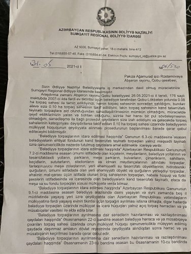 2 gün əvvəl isə ƏN-nin Sumqayıt Regional İdarə rəisi Sahib Bayramovun 31 may 2021-ci ildə inzalayıb göndərdiyi formal cavab məktubunu aldım. Məktubda qeyd edir ki, guya mən 2007-ci ildə Qobu-Lökbatan yolunda 0.08 ha torpağı alıb satmışammış.” Cavab olaraq bildirim ki, mənim bu alqı-satqıdan xəbərim olmayıb. Bu yaxında məlum olub ki, sözügedən torpaq sahəsi bələdiyyə sədri tərəfindən arxa tarixlə əvvəlcə mənim adıma formal sənədləşdirilib. Və guya tərəfimdən Yevlaxdan olan hansısa Fuad adlı şəxsə də satmışammış.Bəs mənim notariusda imzam necə olsun? Ailə üzvlərimin razılığı necə olub? Bunların istintaqın işləridir ki, saxta sənədlər tərtib edərək yerli sakinlərin adından onların xəbəri olmadan kənar fiziki şəxslərə Qobu torpaqlarını satmaqla əsassız varlanıb harınlayıblar. Buna hüquqi qiymət verilməlidir. Sonra isə Sahib Bayramov qeyd edir ki, “ Sizə 0.10 ha torpaq sahəsinin təklif edildiyini, lakin bu torpaq sahəsinin kənd təsərrüfatlı torpaqlara aid olduğundan sənədləşməsi mümkün olmadığı, müraciətdə qeyd etdiklərinizin yalan və böhtan olduğu, gələcəkdə torpaq sahəsinin kateqoriyasının dəyişdirlərsə sizə təklif edilən 0.10 ha torpaq üzərində bələdiyyənin mülkiyyət hüququnun qeydiyyata alınması proseduru başa salınmışdır.”