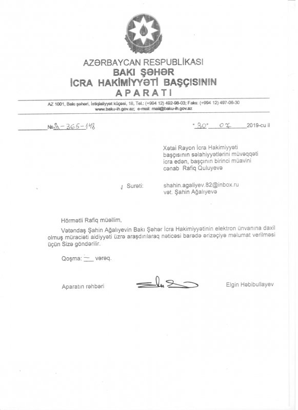 Əmlak Məsələləri üzrə Dövlət Komitəsi ərazinin əvvəlki vəziyyətə qaytarılması ilə bağlı yerli İcra Hakimiyyəti orqanlarına müraciət edir, SOCAR ərazidə neft rezervuarlarının olduğundan hər hansı bir tikilnti işinin aparılmasına qanunun yol vermədiyini bildirir. Bəs Bakı şəhər İcra Hakimiyyəti niyə tədbir görmür? Bakı şəhər İcra Hakimiyyətinin aparat rəhbəri Elgün Həbibullayev Xətai rayon İcra Hakimiyyəti başçısının birinci müavini, Xəta rayon İcra Hakimiyyəti başçısının səlahiyyətlərini icra edən Rafiq Quliyevə ünvanladığı 30 iyul 2019-cu il tarixli məktubda sözügedən ərazidə arşdırma apararaq mənə (vətəndaş Şahin Ağıliyevə) məlumat verməyi bildirmişdir. Lakin üstündən bu qədər müddət keçməsinə baxmayaraq nə Xətai rayon İcra Hakimiyyəti, nə də mərkəzi icra hakimiyyəti olaraq Bakı şəhər İcra Hakimiyyəti sözügedən ərazini əvvəlki vəziyyətinə gətirməmişlər. Səbəb nədir?