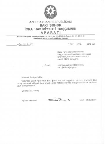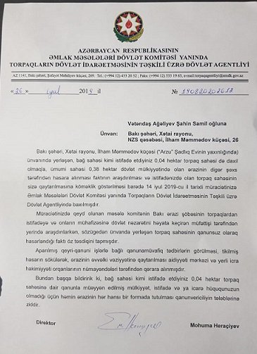 Mən, məcbur olub aidiyyatı qurumlara 14 iyulda müraciətlər ünvanlamışdım. Respublika Prezidenti İlham Əliyev cənablarına ünvanlanmış müraciətə dərhal reaksiya verilir və ərazidə aparılan tikinti işləri dayandırılır. Əmlak Məsələləri üzrə Dövlət Komitəsinə olunmuş müracıətə isə 24 iyul 2019-cu ildə cavab verilir ki, komitənin Bakı ərazi şöbəsinin torpaqlardan istifadəyə və onların mühafizəsinə dövlət nəzarətini həyata keçirən müfəttişi tərəfindən yerində araşdırılarkən, sözügedən ünvanda yerləşən torpaq sahəsinin qanunsuz olaraq hasarlandığı faktı öz təsdiqini tapmışdır. Aparılmış qeyri-qanuni işlərlə bağlı qanunamüvafiq tədbirlərin görülməsi, tikilmiş hasarın sökülərək, ərazinin əvvəlki vəziyyətinə qaytarılması aidiyyəti mərkəzi (Bakı şəhər İcra hakimiyyətinə) və yerli icra hakimiyyəti orqanlarına həvalə edilməsi qərara alınmışdır.