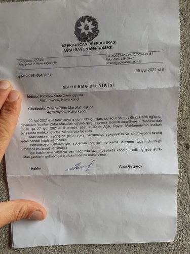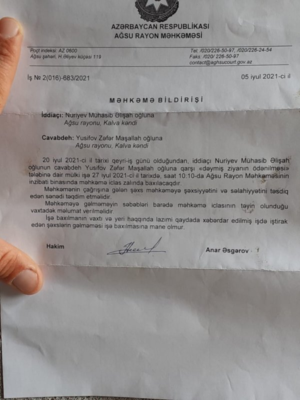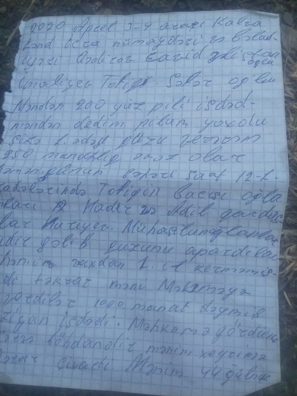 2020-ci ilin aprelin 3-4 arası Kalva kənd icra nümayəndəsi və bələdiyyə sədri ( Qədirov Cavid və İmaməliyev Tofiq) ərazidə qoyun otardığıma görə gəlib məndən 200 manat pul istədilər. Mən də dedim ki, pulum yoxdur. Pul əvəzi sizə 1 ədəd 250 manatlıq quzu verə bilərəm. Və pul əvəzi olar. Həmin günün səhəri 12-1 arası radələrində Bələdiyyə Tofiqin bacısı oğulları Nadir və Adil qardaşları və Nuriyev Mühasibin oğlanları gəlib quzunu apardılar. Lakin həmin vaxtdan 1 il keçməmiş onların –kənd icra və bələdiyyə sədrinin yaxın qohumları təkrar m\ni Ağsu məhkəməsinə verib və guya qoyunların onların ərazini otlaması bəhanəsilə hərəsi məndən 1000 manat pul istədilər. İddiaçıar olan Oraz kənd bələdiyyəsi sədrinin əmisi, digər iddiaçı Mühasib də yaxın qohumlarıdır. Məhkəmə gördü ki, yazılanlar böhtandır, mənim xeyrimə qərar çıxardı. Mən 44 günlük müharibədə kürəkənim 3 azyaşlı uşaq atası şəhid Elgün Əzizovun yetim qalmış övladlarına hazırda baxıram. İndi şəhidin 3 yetim körpə balası mənim yanımda qalırlar. Özüm Şamaxının Qurdtəpə kəndidndən olsam da mal-qara saxlamaq üçün Aösu rayonun Suraxanı kəndində yaşayan Səfərov Bəhrama məxsus fermada yerləşmiş və burda çalışıram.