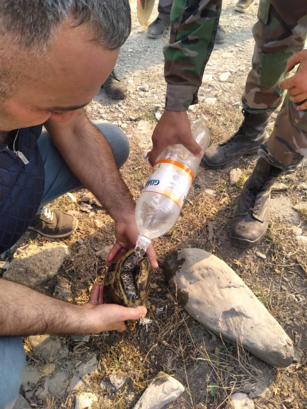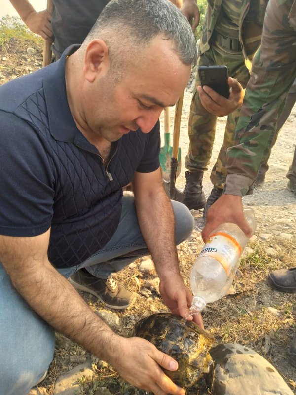 Abrıx meşəsində yanğın zamanı ETSN səlahiyyətlisi Alim Əlizadə yanğından qaçan tısbağaya su verir