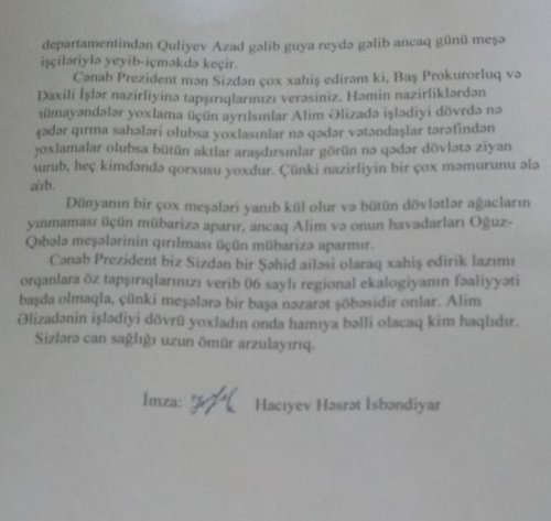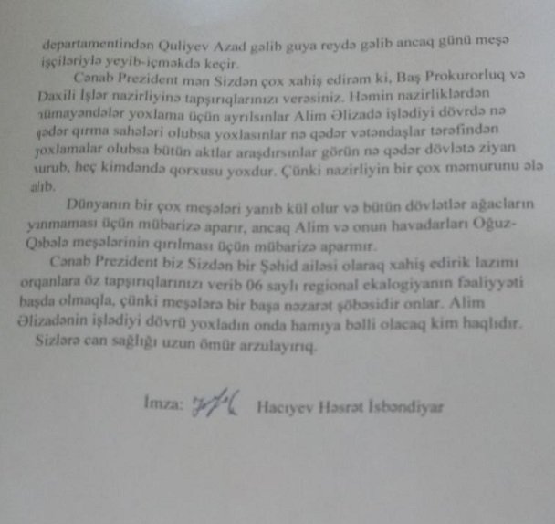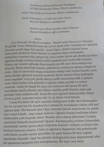 B arada xatırlatmaq bir daha yerinə düşərdi ki, Qəbələ rayonun Həmzəli kənd sakini Həsrət Hacıyev yuxarı instansiyalara göndərdiyi şikayət məktubunda Qəbələ rayonu ərazisində hansı meşələrdə kütləvi ağackəsimlərinin olması xatırlanmışdır. Maraqlıdır ki, hazırda yanğın törədilən ərazilər İFADETV-nin də dəflərlə kütləvi ağac kəsimləri barədə yazdığı ərazilərdir. İndi təbii sual ortalığa çıxır: Niyə son 10 ildə ən çox ağac kəsimi olan ərazilərdə eyni vaxtda ardıcıl olaraq yanğınlar baş verir? Belə təsadüf ola bilərm? Bzcə yox. Ümid edirik ki, yaxın zamanlarda təbii sərvətlərimizə qənim kəsilmiş yadlli ünsürlərin kimliyi və əsas məqsədləri məlum olacaqdır.