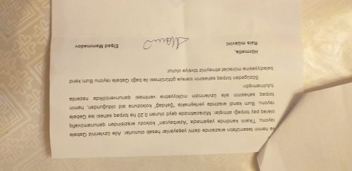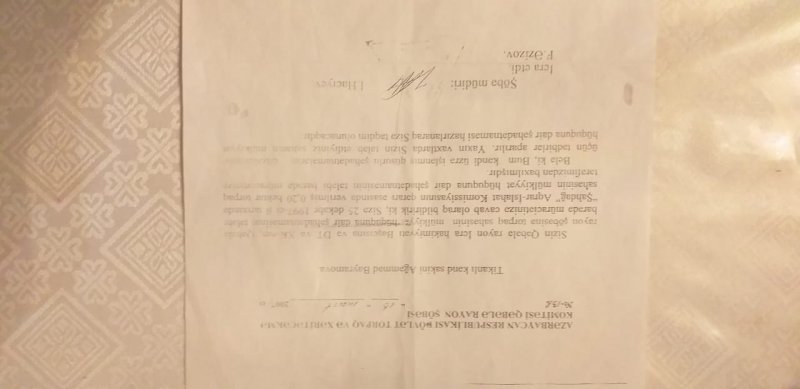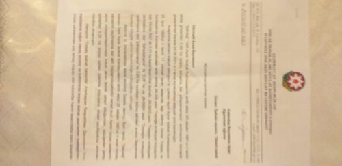 Cənab Prezident. Bir daha xatırlatmaq istəyirəm ki, bizim hazırda köhnə və təmirsiz 3 otaqlı ata yurdu hesab edilən və 90 il əvvəl inşa edilmiş heç bir şəraiti olmayan evimizdə on 28 ildə bizim ailəyə dövlət tərəfindən heç bir imtiyaz tətbiq edilməmişdir. Nə bir avtombil, nə bir mənzil, nə bir iş, nə pul mükafatı, nə bayram günlərində həttaH.Əliyev Fondunun təşkil etdiyi yardımlardan yaralanmışıq. İstədiyimiz tək bir mənzil problemini həll etmək üçün bizim adımıza verilən bu 0.2ha torpaq sahəsidir ki, onu da sənədləşməsinə imkan verilmir, yerli bələdiyyə isə özbaşına satıb mənimsəmək istəyir. Bu torpağı sənədləşdirə bilsəydik ev tikmək barədə düşünərdik. Nə yazıq ki, yerli bürokratlar biz şəhid ailəsinə nəinki kömək etmək, heç maraqlanmayıbar, İndi də bürokratiya grdabında qalmışıq pis vəziyyətdə. Bilmirik kimə müraciət edək. Ona görə son ümid yeri kimi Sizə rəsmi müraciət edərək xahiş edirik ki, 1997-ci ildən bizə ayrılmış 0.2 ha ərazinin mülkiyyət sənədinin alınmasına və həmin ərazidə dövlət hesabına şəhid ailəsi üçün bizə ev tikilməsinə göstəriş verəsiniz".