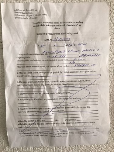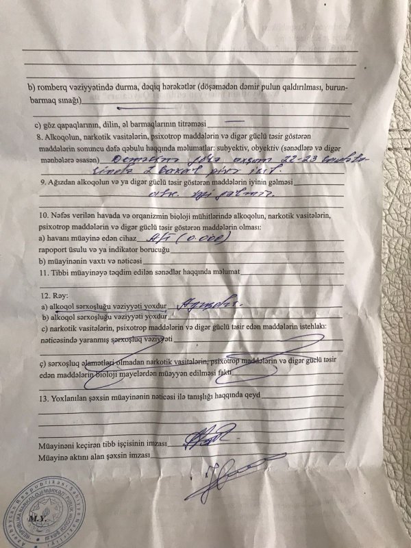 Çoxhörmətli Prezident! Nəzərinizə çatdırmaq istərdik ki, son vaxtlar Daxili İşlər Nazirliyinin YPX əməkdaşları tərəfindən sürücülərə qarşı heç bir standart və normalara cavab verməyən ( Çin istehsalı olan) saxta cihazlardan istifadə etməklə qanunsuz protokol yazmaları və ya bunun yazılmaması üçün alver etmələri barədə çox eşitmiş, amma inanmamışdıq. Lakin 19 oktyabr 2021-ci il, gecə saat 00-15 dəqiqədə dostum Fuad məxsus 90 LT 938 N-li “Hundai A-30” markalı avtomobili Xətai rayonu, Afyəddin Cəlilov küçəsindən “Cavanşir” körpüsü istiqamətində idarə edərkən, “Meqafan” –la üzbəüz yerdə 372 N-li YPX avtomobilinin əməkdaşları Rəşad və Samir adlı polis çavuşları saxlamış, əvvəlcə sürətli idarə etdiyimzi bizə bildirmiş, etriaz etdikdə isə mənə sərxoş olub olmamağımı yoxlamağı təklif etdilər. Etiraz etmədim. Onlar mənə adi bir alışqana bənzər “kitayski” aparata üfürməyi dedilər. Üfürmə zamanı guya məndə 10 mp ml. Spirtli içki olmağım “sübuta” yetirildi. Mən etiraz etdim ki, siz nə danışırsınız? Normal aparat gətirin və ya məni həkim məntəqəsinə aparın görüm sizin nəticəni təsdiq edirmi? Onlar özlərini təqdim etməyən sonradan adlarını öyrəndiyim Samir və Rəşad adlı YPX çavuşları avtomobildən bu dəfə digər normal alkotest metal-aparatı gətirdilər ki, buna üfürün və məni 5 dəfə təkrar təkrar üfürməyə məcbur etdilər. Lakin hər dəfə aparat heçnə göstərmədi. YPX əməkdaşları mənim üstümə qışqırdılar ki, sən düzgün üfürmürsən, yoxsa aparat göstərər və s. çərənləmələr etdilər. Bu arada protokol yazmağı ameranın altıdırtəklif etdilər ki, bəs kameranın altıdır, biz nəsə bu işi sənədləşdirməliyik. Protokol yazdılar, mən etiraz edib imzalamadım. Bunlar əvvəlcə mənə təklif etdilər ki, gəl sən 700 manat ver çıx get bu iş burada bitsin. Razılaşmadım ki, nəyə görə sizə yolun ortasında cərimə pulu ödəməliyəm. Dərhal o biri əməkdaş mənə xəbərdarlıq etmədən avtomobili “Ağ şəhər” yaxınlığındakı cəriməmeydançasına apardı. YPX əməkdaşlarının mənimlə belə açıq-aşkar “alver etmə” cəhdlərindən dərhal başa düşdüm ki, bunlar üzırilərində olan xidməti mikrofonu qanunsuz olaraq söndürüb mənimlə rahat şantaj yoluilə cərimə adı altında pul tələb edirlər.Sonda onlar mənə heç bir sənəd vermədən bildirdilər ki, sənədləri məhkəməyə göndərəcəyik. Onarın bu hərəkəti və sürücülərə yanaşması qanunsuzdur və barələrində tədbir görülməlidir. Mən avtomobildə olan dostum Fuadla birlikdə hadisədən 1-2 saat ərzində Yasamal rayonu, Cəfər Cabbarlı küçəsi 38-də yerləşən Səhiyyə Nazirliyinin Sərxoşluq vəziyyətinin tibbi müayinə məntəqəsinə gəlib testdən keçdim. Nəticə yenə də “0” pml göstərdi. Tərtib edilmiş 2/ 30100 n-li aktı alıb gəldim ki, şikayət verim.sənəddə mənim həmin axşam saat 22-23-00 arası içib-işməməyimlə bağlı nəticə qeyd edilmişdir. Bu barədə DİN-nin 102 xidmətinə YPX əməkdaşlarının özbaşnalıqlarından 2 dəfə şikayət vermişəm. YPX işçiləri mənə heç bir sənəd və ya protokol verməmişdilər. Səhəri gün Bakı şəhər Yol İdarəsinə gəlib 14-cü otaqda polis mayoru Xəlillə görüşdüm. O da sürücülük vəsiqəmi alıb talon verdi ki, avtomobili cərimə meydançasından çıxara bilək. Hadisədən 2 sutka sonra isə mənə mesaj gəldi ki, siz İnzibati Xətaya görə 333.1 maddəsinə görə 400 manat cərimə olunursunuz. Və o da məlum oldu ki, Rəşad və Samir adlı YPX işçiləri protokol tərtib edərkən guya məni gecə hadisədən əvvəl saxladıqlarını qeyd etmişlər. Deməli, bu o deməkdir ki, bu YPX işçilərinin növbə vaxtı gecə saat 23-də bitdiyi üçün məni şərləyərək məcbur yazdıqları İPX 4262252 N-li protokolun tərtib edilmə vaxtını da qəsdən 2 saat əvvəl göstəriblər. Yəni, 3 ekipaj üzvü xidməti vaxtı bitdiyindən evlərinə getmək əvəzinə A.Cəlilov küçəsində yalançı xidmətlərini üstlərində olan mikrofonları söndürdükdən sonra rahat formada sürücüləri şantaj edərək pul qoparma məqsədilə əlavə olaraq xidmətlərini qanunsuz davam etdiriblər ki, evdə acından ağır vəziyyətdə olan ailə üzvlərinə çörək apara bilsinlər.