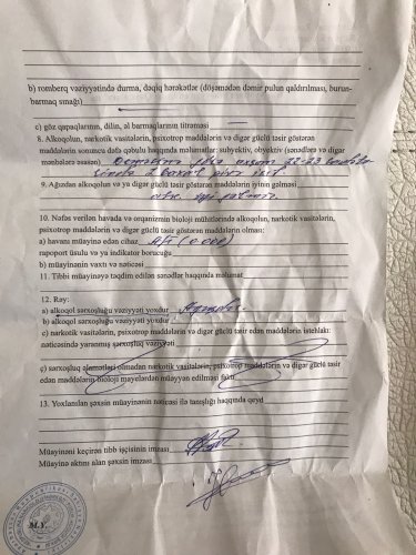 "Əgər həmin yoxlamada 0,3 promildən yuxarı spirtli içki çıxar və sürücü də buna etiraz etməzsə, ona yerində protokol tərtib edilə bilər. Ancaq, sürücü alkotesterin nəticəsinə şübhə edirsə, və sərxoş olmadığından əmindirsə həkim müayinəsi tələb etməlidir. Bu vaxt yol polisi sürücünü həkim müayinəsinə aparır və qan analizi götürülür. Əgər hər iki nəticə üst-üstə düşürsə protokol tərtib olunur. Əgər üst-üstə düşmürsə həkimin yazdığı rəy əsas götürülür".