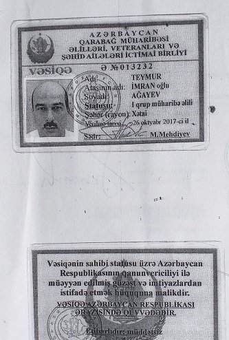 Dərin hörmətlə, Qarabağ müharibəsi veteranı, 1-ci qrup əlil T.İ.Ağayev