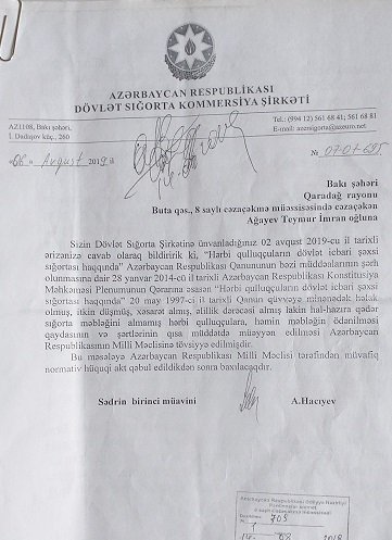 Mən digər əlil olmuş müharibə veteranları kimi Dövlət sığorta Kommersiya şirkətinə 02 avqust 2019-cu il tarixində müraciət edərək xahiş etmişdim ki, “Hərbi qulluqçuların dövlət icbarı şəxsi sığortası haqqında” Azərbaycan Respublikasının Qanununa əsasən uyğun olan sığorta ödənişi etsin. Lakin çox təssüflər olsun ki, Dövlət sığorta Kommersiya şirkəti sədrinin birinci müavini A.Hacıyevin imzası ilə aldığım 06 avqust 2019-cu il tarixli formal cavab məktubunda bildirilir “ 28 yanvar 2014-cü il tarixli Azərbaycan Respublikası Konstitusiyası Məhkəməsinin Plenumunun Qərarına əsasən “Hərbi qulluqçuarın dövlət icbari şəxsi sığortası haqqında” 20 may 1997-ci il tarixli Qanun qüvvəyə minənədək həlak olmuş , itkin düşmüş, xəsarət almış, əlillik dərəcəsi almış lakin hal hazıra qədər sığorta məbləğini almamış hərbi qulluqçulara, həmin məbləğin ödənilməsi qaydasının və şərtlərinin qısa müddətdə müəyyən edilməsi Azərbaycan Respublikasının milli Məclisinə tövsiyə edilmişdir. Bu məsələyə AR Milli Məclisi tərəfindən müvafiq normativ hüquqi akt qəbul edilkdikdən sonra baxılacaqdır.”