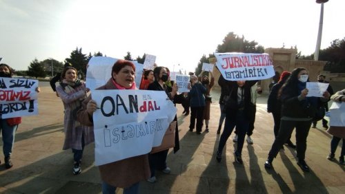 Jurnalistlər "Mürtəce qanuna yox!", "Azad mətbuat", "Reyetsri də götür, bas bayıra" şüarları səsləndiriblər.