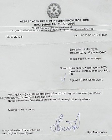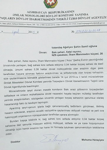 Məslən, Əmlak Məsələri Dövlət Komitəsi yanında Torpaqların Dövlət İdarəetməsinin Təşkili üzrə Dövlət Agentliyi tərəfindən araşdırılmış və direktor Mohuma Heraçiyevin imzaladığı 26 iyul 2019-cu il tarixli məktubda qeyd edilmişdir ki, “ Müraciətinizdə qeyd edilən məslə komitənin Bakı ərazi şöbəsinin torpaqlardan istifadəyə və onların mühafizəsinə dövlət nəzarətini həyata keçirən müfəttişi tərəfindən yerində araşdırılarkən, sözügedən ünvanda yerləşən torpaq sahəsininqanunsuz olaraq hasarlandığı faktı öz təsdiqini tapmışdır.
