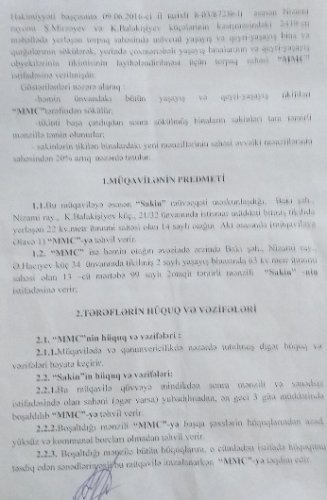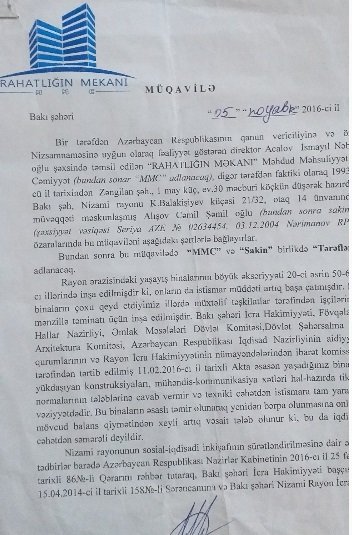 "Biz, Ağdam, Cəbrayıl və Zəngilan rayonlarından olan 9 məcburi köçkün ailəsi 1994-cü ildən Nizami rayonu, Əlif Hacıyev küçəsi, ev 21\23-də yerləşən yataqxana və onun balansında olan torpaq sahəsində yaşamışıq. Yaşadığımız bananın və torpağın yerində rəsmi dövlət orqanları rəhbərlərinin iştirakıilə “Rahatlığın Məkanı” MMC rəhbərləri arasında olan rəsmi razılaşmalara görə burada 4 ədəd 16 mərtəbəli binalar tiliklmişdir. Razılaşmaya əsasən MTK-nın əsil sahibi olan Akif Mustafayev bizi yaşadığımız mənzillərdən köçürmək üçün hər otağa görə pul kompensasiyası təklif etdi. Razılaşmayanlara isə tikdikləri binadan mənzillə təmin edəcəklərini söz verdilər. Bakı şəhər İcra Hakimiyyəti başçısının göstərişi olub ki, sakinlərlə razılaşdırılmalıdır ki, binanın inşasına start verilsin. Bu razılıq əsasında 7 ailəyə yaşadıqları otaqlara uyğun pul ödənildi. Mən və qardaşım Cəmil isə cəmi 3 otaqlı , yəni, 70 kv m. sahəsi olan mənzilin təhvil verilməsi müqabilində razılaşdığımıza görə “Rahatlığın Məkanı” MMC-nin direktoru Acalov İsmayıl Nəbi oğlu ilə mənim və qardaşım Cəmil Alışov arasında 05 nyabr 2016-cı il tarixli rəsmi MÜQAVİLƏLƏR bağlanmışdır. Müqaviləyə əsasən MMC Nizami rayonu, Ə.Hacıyev küçəsi 34 ünvanında tikilmiş 2 saylı yaşayış binasında 63 kv.m ümumi sahəsi olan , 6-cı mərtəbə, 36 saylı 2 otaqlı mənzili Azər Alışova, yenə həmin binada 13-cü mərtəbədə 99 saylı, 2 otaqlı mənzili Cəmil Alışova təhvil verdikləri mənzillərin əvəzi olaraq verilmişdir.