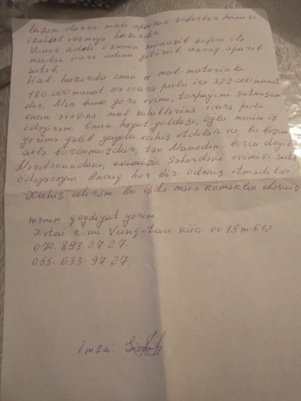 "Mən, işimlə əlaqədar son illər Bakının Sabunçu rayonu ərazisində Zabrat qəsəbəsində icarəyə götürdüyüm yerdə tikinti materiallarının icarəsi və satışı ilə məşğul oluram. 2019-cu ildə əslən Qusar rayonundan olan, Bakı şəhəri, Xəzər rayonu, Mərdəkan qəsəbəsində yaşayan Əbdürəhimov Minavəddin Daşdəmir oğlu mənə yaxınlaşaraq bildirdi ki, o inşaat iş icraçısı olaraq Bakıda sifarişlər əsasında şəxsi evlər və obyekt tikintisi işilə məşğul olur. Bu adamın Bakı şəhərində 4 evinin olduğu məlum oldu. Minavəddin ( el arasında ona Mamed adıilə müraciət edirlər.) hər dəfə icarə adı altında Yunus adlı şoferilə yaxınlaşaraq müxtəlif tikinti materiallarını alıb aparırdı. Və məni inandırdı ki, Bakıda yaşadığı evləri satıb bütün pullarını-borcunu ödəyəcəkdir. Əvvəl buna əhəmiyyət vermirdim. 2019-2021-ci illər ərzində bu adam mənim obyektimdən lazım olan materialları nisyə olaraq daxili qaimə faktura sənədləri əsasında daşıdı. Hətta material mənim obyektimdə olmayanda mənim əvəzimə qonşu sahibkarlarda olan materialları da icarə adı ilə daşıdı, lakin heç birini qaytarmadı. Məlum oldu ki, bu adam məni aldatmaqla məşğul olub. O mənim etibarımı qaznmaq üçün peşəkarcasına əvvəl əvvəl götürdüyü mal-materialın pullarını bir iki dəfə verirdi. Sonra isə daimi müştəri kimi özünü göstərərək dələduzluq metoduna keçdi. Nəticədə Minavəddin bu günə kimi 180000 manatlıq müxtəlif inşaat materiallarını icarə adı altında götürmüş və heç birini geri qaytarmamışdır. Bu materiallardan 1790 ədəd dəmir dirəyi Məzahir adlı qonşu sahibkardan icarəyə götürmüşdüm və indi də ona borclu qalmışam. Seyid adlı şəxsdən isə 2200 dəmr dirək, 320 ədəd dəmir rama, 530 ədəd dikt, 10 kub m. taxta və 24500 manat icarə pulu borcum qalmışdır. Bu gün də materialları ona daşıyan sürücülər bidirirlər ki, faktı istənilən zaman rəsmən təsdiq edə bilərik. O da məlum olub ki, özünə münasib Yunus adlı sürücü ilə bizdən icarə adına götürüb daşıdığı materialların hamısını aparıb satıb pulunu mənimsəmişdir. Hal hazırda Minavəddinin icarə adına götürdüyü malların dəyəri 180000 manat, icarə pulu isə 322000 manat bizə brcu yığılıb qalmışdır.Cəmi 502000 manat. Budur, borcluların bir hissəsini ödədmək üçün Oğuz şəhərində olan evimi və torpağımı satıb ödəmişəm. Onun Bakıda yaşayan arvadı və oğlu da mənim yanıma gəlib bildirdilər ki, narahat olmayım, kişinin borcu bizim ailənin borcudur və evlərimizi satıb ödəyəcəyik. Ancaq bu günə kimi heç bir ödəniş olmayıb. Doğrudur, Minavəddin əvvəllər borcunu qaytarmağa söz versə də 2021-ci ilin oktyabrında Bakıda Binəqədində mebel sexində işləyən oğlu Tərlan mənə zəng edib bildirdi ki, bir də atası ilə görüşməsin və ona zəng etməyim. Bildirdi ki, atasına da deyib ki, Yavərə heç bir pul vermirsən. Mən., Binəqədidə 1-ci xanım Mehriban Əliyevanın mebel sexini işlədirəm. Heç kimdən qorxmuruq, get hara istəyirsən şikayət et, atam sənə pul verməyəcək. Bildirim ki, atası da hazırda Bakıda “Gənclikdə” “Kral” şadlıq evinin yanındakı bir kafeni icarəyə götürüb işlədir. Mənə qarşı da bu ailə açıq-aşkar Mehriban xanımın adından süi-istifadə edərək dələduzluq edirlər, pulumu qaytarmırlar. Mənə sonradan məlum oldu ki, bu ailə belə başqalarına da mənə etdikləri kimi dələduzluqlar edib qazanmaqla Bakıda 4 yerdə bahalı evlər almışlar.