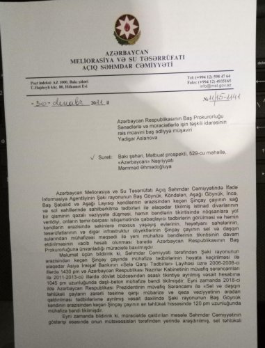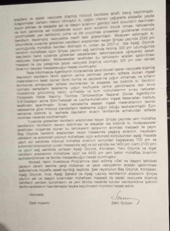 “ ...ASC-nin göstərişi əsasında onun mütəxəssisləri tərəfindən yerində araşdırmış,sel təhlükəli ərazilərə və qəzalı vəziyyətə düşmüş mövcud bəndlərə baxış keçirilmişdir. Məlum olmuşdur ki, yağan intensiv yağışlarla əlaqədar çaylarda suyun artması ilə əlaqədar suların gətirdiyi bərk suxurlar tərəfindən yan sahilyönlü yuma və dib yuyulması prosesləri güclənərək bəndlərin dayanıqlıq vəziyyətinə mənfi təsir etmişdir.Müəyyən edilmişdir ki, Şinçay çayında 2595 p\m uzunluğunda mühafizə bəndi tikilmişdir.